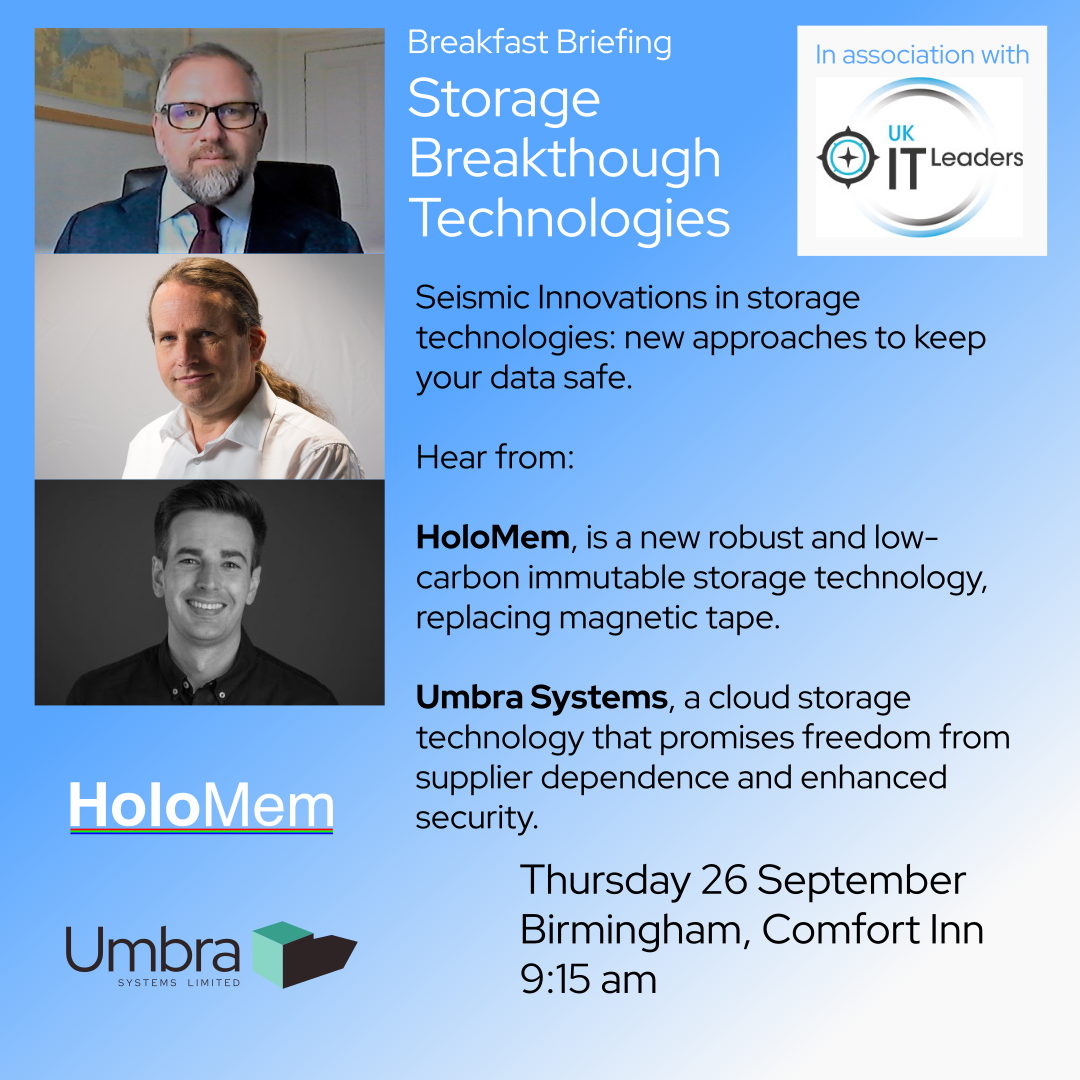A chance to meet the people behind the ground breaking technologies changing storage. With HoloMem, a new immutable storage to replace magnetic tape for large scale storage of data. Umbra Systems will be showing ShadowStream™ to provide resilient and secure cloud object storage. Reserve your spot here: Eventbrite.